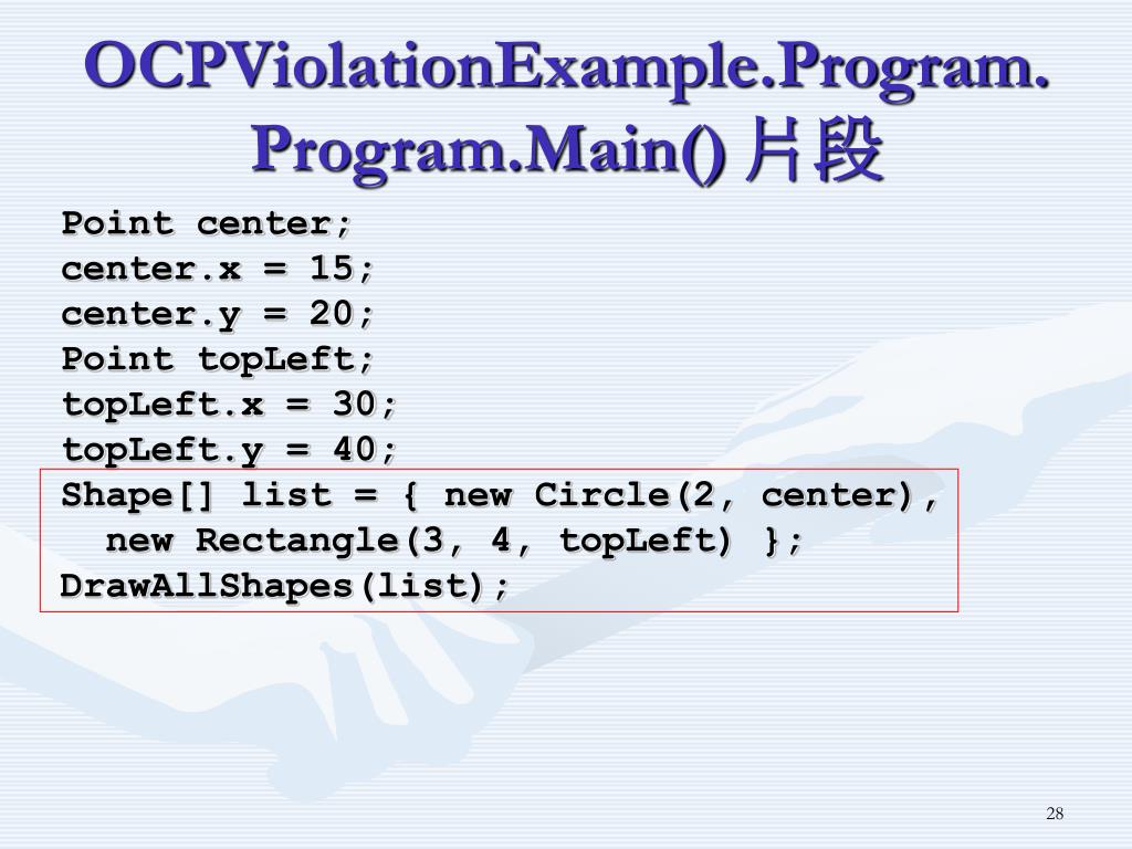 OCPViolationExample.Program.Program.Main() 片段 Point center; center.x = 15; center.y = 20; Point topLeft; topLeft.x = 30; topLeft.y = 40; Shape[] list = { new Circle(2, center), new Rectangle(3, 4, topLeft) }; DrawAllShapes(list);