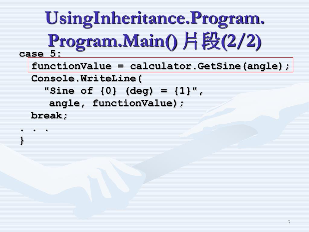UsingInheritance.Program.Program.Main() 片段(2/2) case 5: functionValue = calculator.GetSine(angle); Console.WriteLine( "Sine of {0} (deg) = {1}", angle, functionValue); break; . . . }