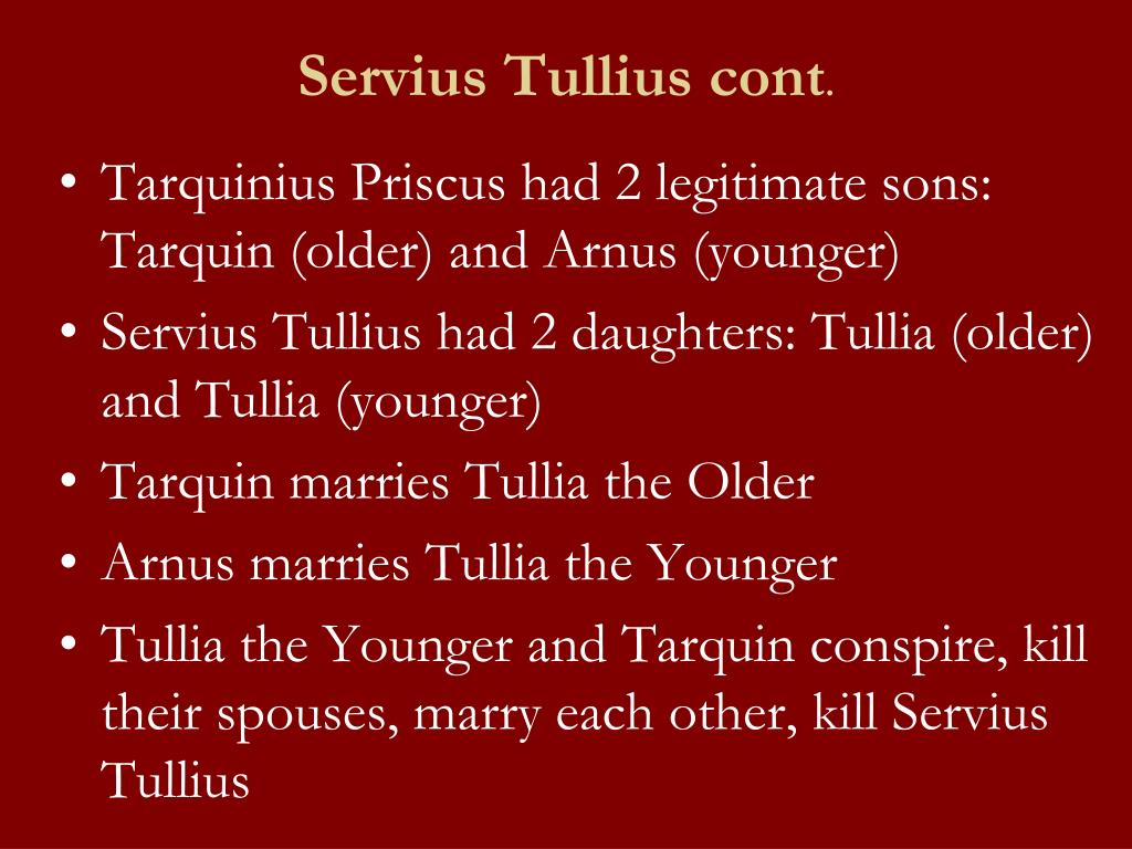 ServiusTullius cont. • TarquiniusPriscus had 2 legitimate sons: Tarquin (older) and Arnus (younger) • ServiusTullius had 2 daughters: Tullia (older) and Tullia (younger) • Tarquin marries Tullia the Older • Arnus marries Tullia the Younger • Tullia the Younger and Tarquin conspire, kill their spouses, marry each other, kill ServiusTullius