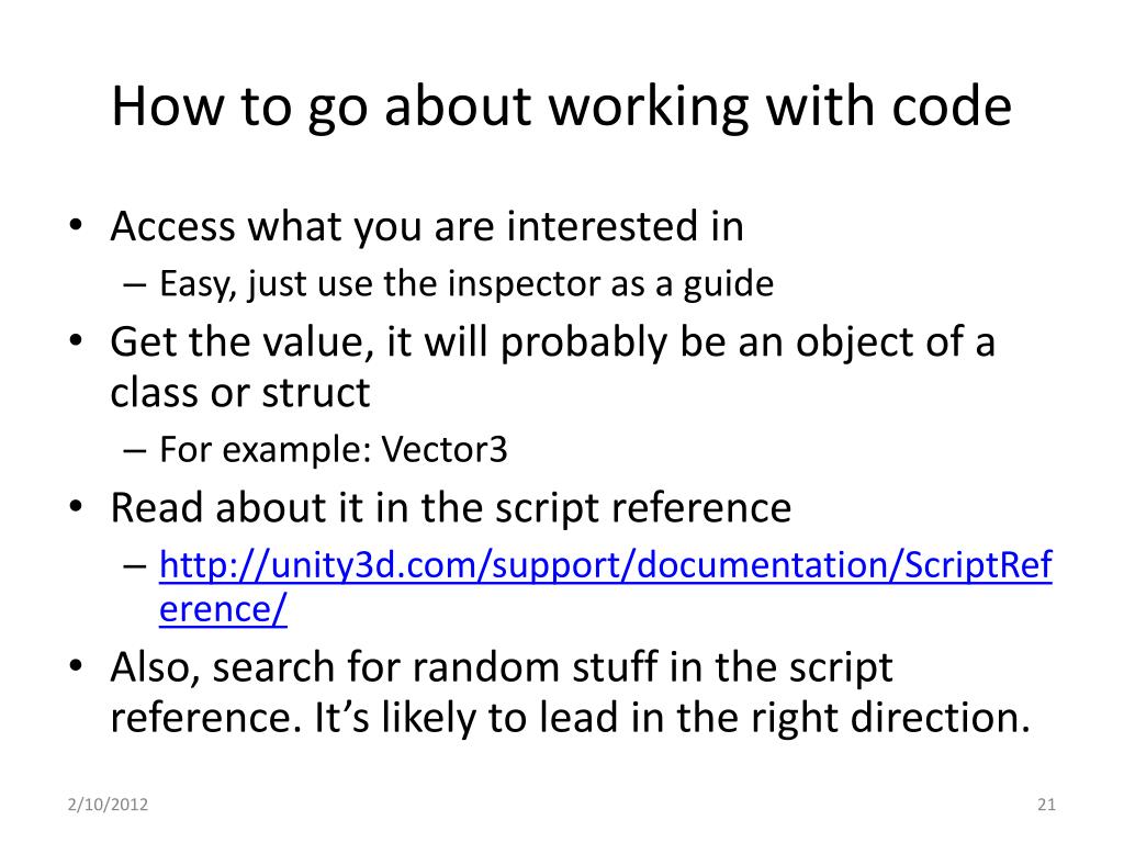 How to go about working with code • Access what you are interested in • Easy, just use the inspector as a guide • Get the value, it will probably be an object of a class or struct • For example: Vector3 • Read about it in the script reference • http://unity3d.com/support/documentation/ScriptReference/ • Also, search for random stuff in the script reference. It’s likely to lead in the right direction.