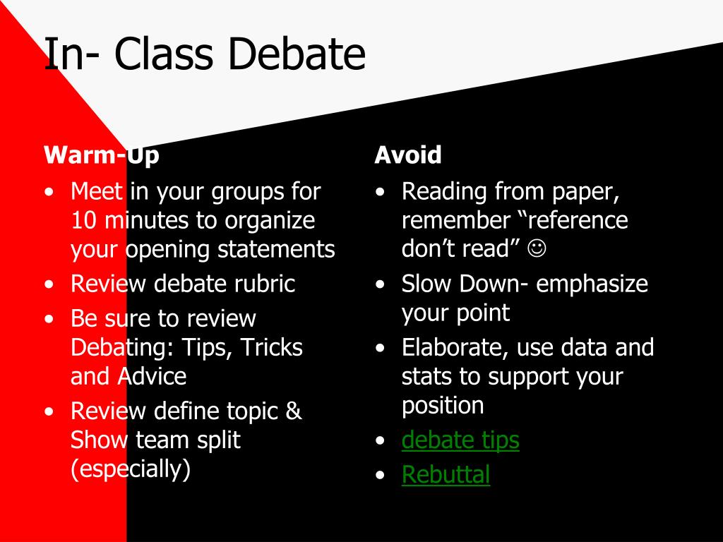 In- Class Debate Warm-Up Avoid Reading from paper, remember “reference don’t read” Slow Down- emphasize your point Elaborate, use data and stats to support your position debate tips Rebuttal • Meet in your groups for 10 minutes to organize your opening statements • Review debate rubric • Be sure to review Debating: Tips, Tricks and Advice • Review define topic & Show team split (especially)