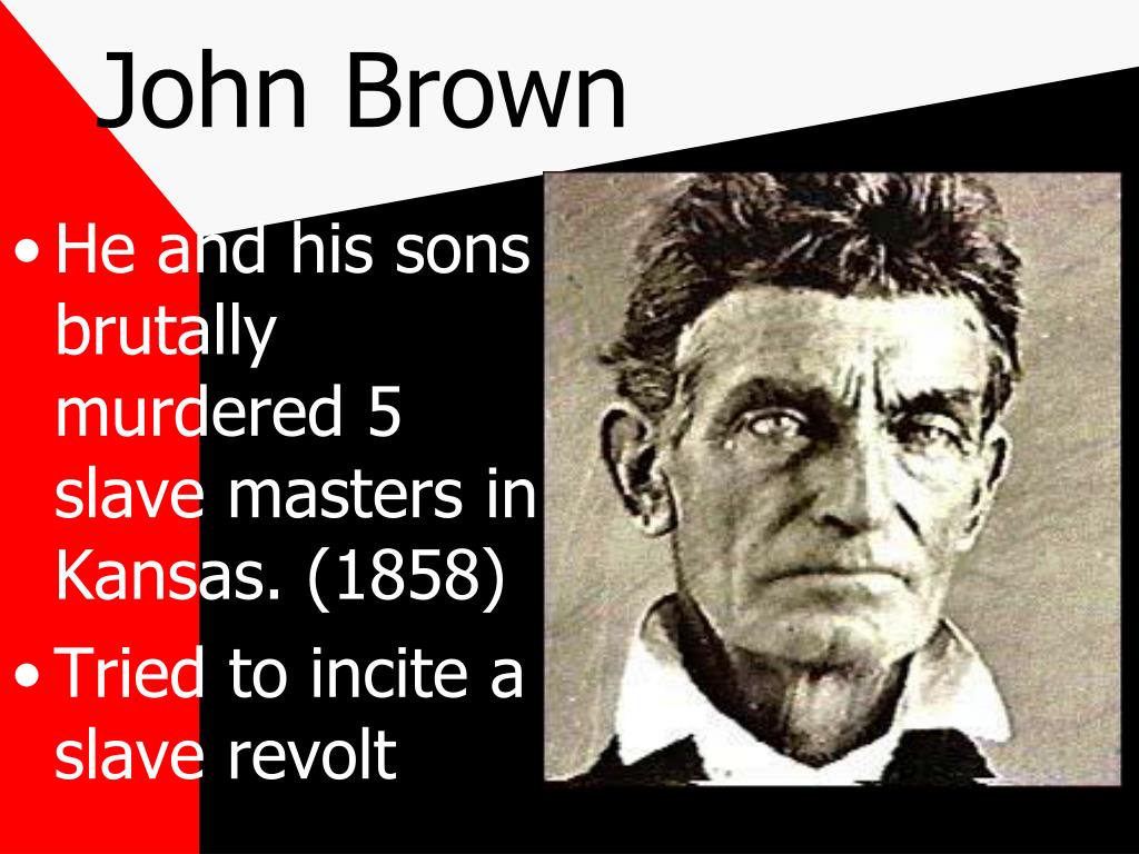 John Brown • He and his sons brutally murdered 5 slave masters in Kansas. (1858) • Tried to incite a slave revolt