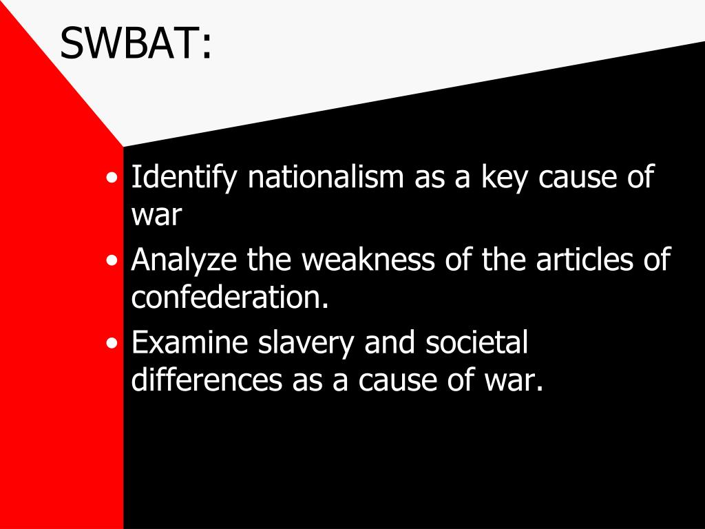 SWBAT: • Identify nationalism as a key cause of war • Analyze the weakness of the articles of confederation. • Examine slavery and societal differences as a cause of war.
