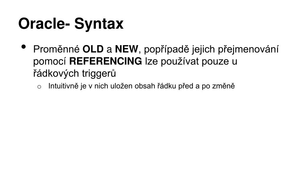 Oracle- Syntax • Proměnné OLD a NEW, popřípadě jejich přejmenování pomocí REFERENCING lze používat pouze u řádkových triggerů • Intuitivně je v nich uložen obsah řádku před a po změně