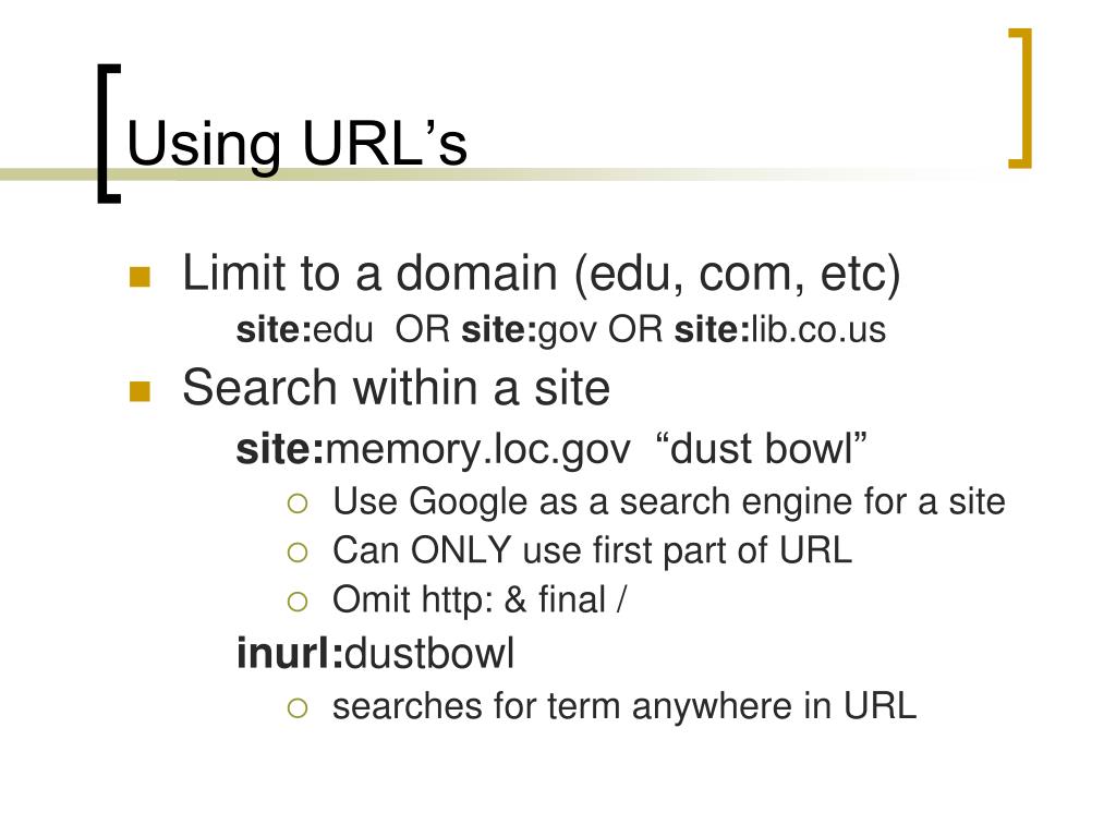 Using URL’s • Limit to a domain (edu, com, etc) site:edu OR site:gov OR site:lib.co.us • Search within a site site:memory.loc.gov “dust bowl” • Use Google as a search engine for a site • Can ONLY use first part of URL • Omit http: & final / inurl:dustbowl • searches for term anywhere in URL