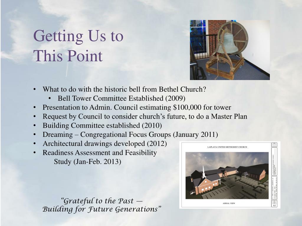 Getting Us to This Point • What to do with the historic bell from Bethel Church? • Bell Tower Committee Established (2009) • Presentation to Admin. Council estimating $100,000 for tower • Request by Council to consider church’s future, to do a Master Plan • Building Committee established (2010) • Dreaming – Congregational Focus Groups (January 2011) • Architectural drawings developed (2012) • Readiness Assessment and Feasibility • Study (Jan-Feb. 2013) “Grateful to the Past — Building for Future Generations”
