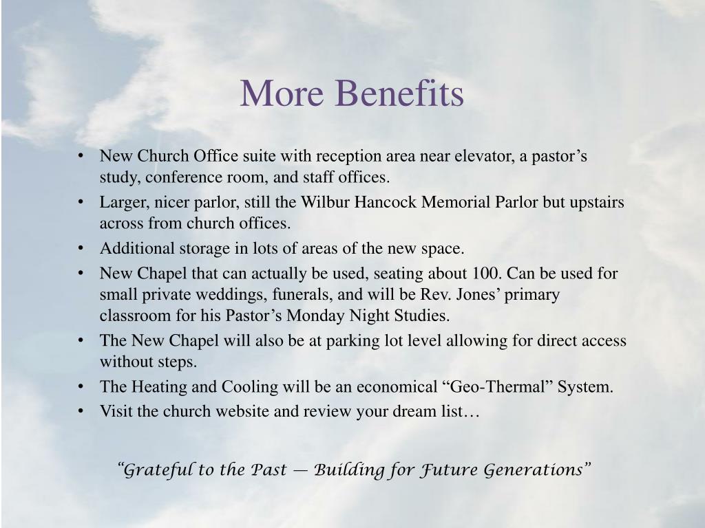 More Benefits • New Church Office suite with reception area near elevator, a pastor’s study, conference room, and staff offices. • Larger, nicer parlor, still the Wilbur Hancock Memorial Parlor but upstairs across from church offices. • Additional storage in lots of areas of the new space. • New Chapel that can actually be used, seating about 100. Can be used for small private weddings, funerals, and will be Rev. Jones’ primary classroom for his Pastor’s Monday Night Studies. • The New Chapel will also be at parking lot level allowing for direct access without steps. • The Heating and Cooling will be an economical “Geo-Thermal” System. • Visit the church website and review your dream list… “Grateful to the Past — Building for Future Generations”