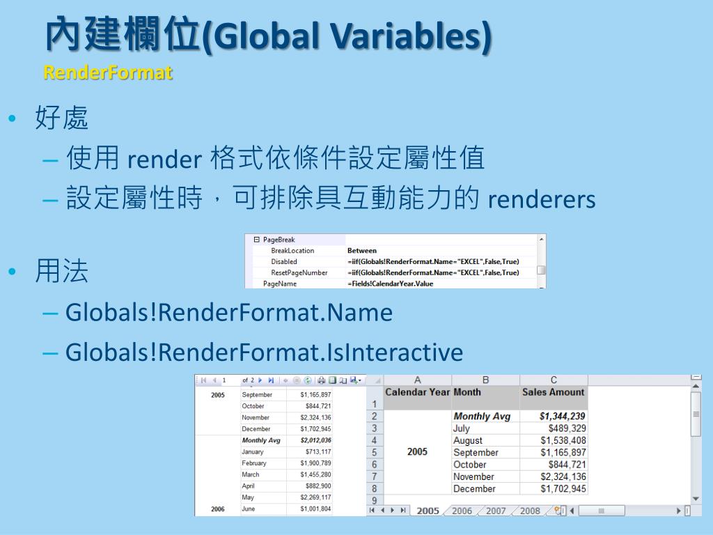 內建欄位(Global Variables)RenderFormat • 好處 • 使用 render 格式依條件設定屬性值 • 設定屬性時,可排除具互動能力的 renderers • 用法 • Globals!RenderFormat.Name • Globals!RenderFormat.IsInteractive