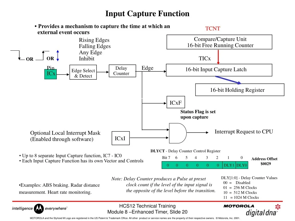 Input Capture, IC7-IC0 (3 of 3) INTERRUPTS: FOR INPUT CAPTURES IC7 – IC0 • TO CLEAR INTERRUPT, WRITE 1 TO ICxF BIT IN TFLG1 DO NOT USE BIT MANIPULATION INSTRUCTIONS (SINCE RM/W OPERATION) • IC7–IC0 VECTORS ARE USED. RESET CONDITIONS: • INPUT CAPTURE FUNCTIONS ARE DISCONNECTED FROM INPUT CAPTURE PINS • INTERRUPTS ARE DISABLED • FLAG BITS ARE CLEARED