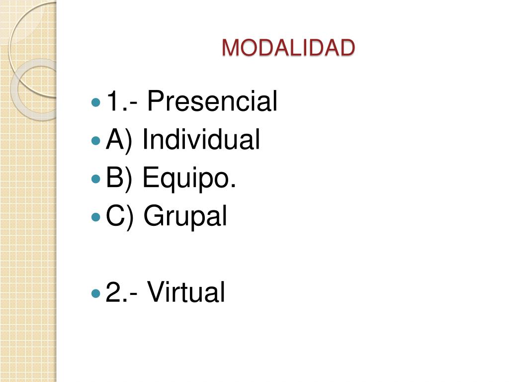MODALIDAD • 1.- Presencial • A) Individual • B) Equipo. • C) Grupal • 2.- Virtual