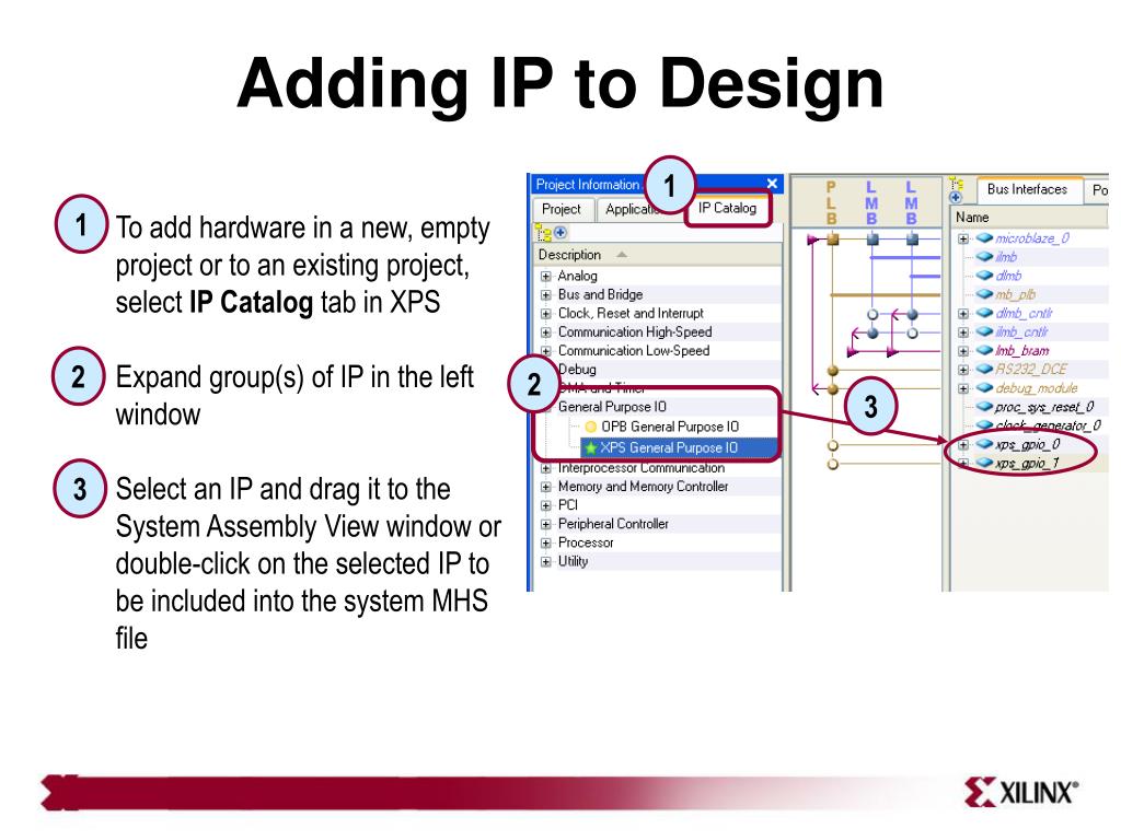 Adding IP to Design 1 1 • To add hardware in a new, empty project or to an existing project, select IP Catalog tab in XPS • Expand group(s) of IP in the left window • Select an IP and drag it to the System Assembly View window or double-click on the selected IP to be included into the system MHS file 2 2 3 3