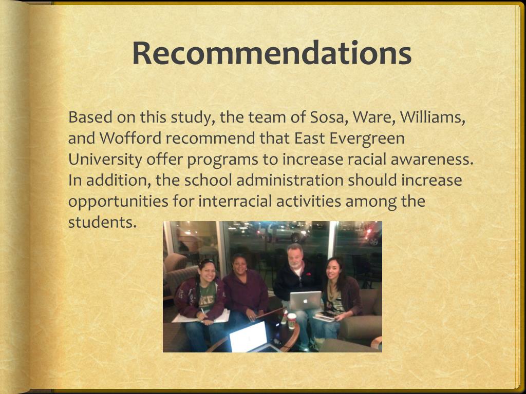 Recommendations Based on this study, the team of Sosa, Ware, Williams, and Wofford recommend that East Evergreen University offer programs to increase racial awareness. In addition, the school administration should increase opportunities for interracial activities among the students.