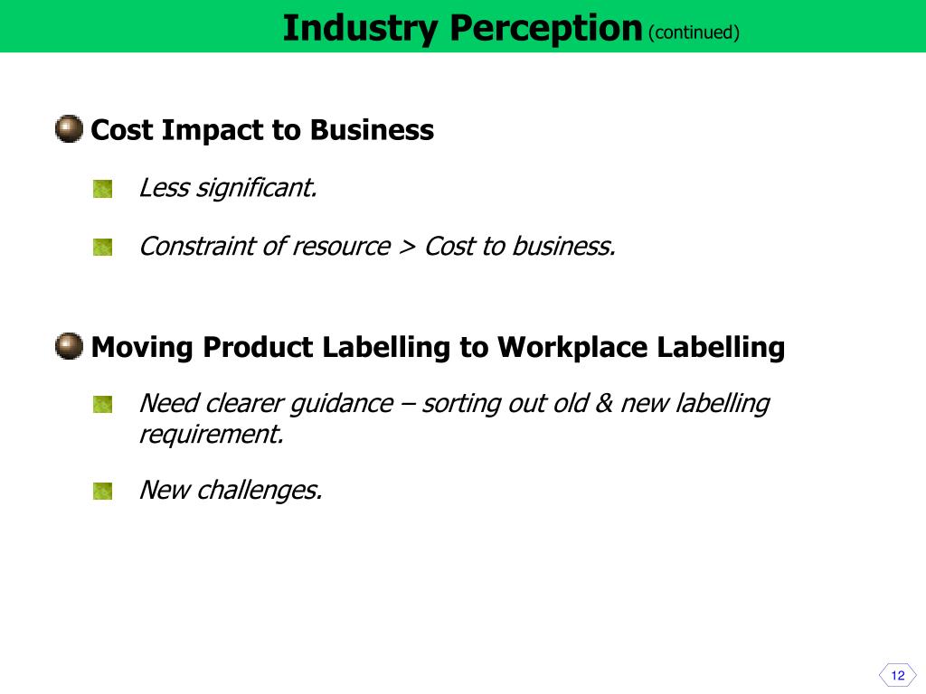 Industry Perception (continued) Expertise for Classification, SDSs & Labels A lack of expertise & competent persons – both in Industries & Government sectors. Shortage – Academic research in GHS work. Resources in Implementing GHS Rely heavily on external classification information. Limited resources – especially from small & medium companies. 11