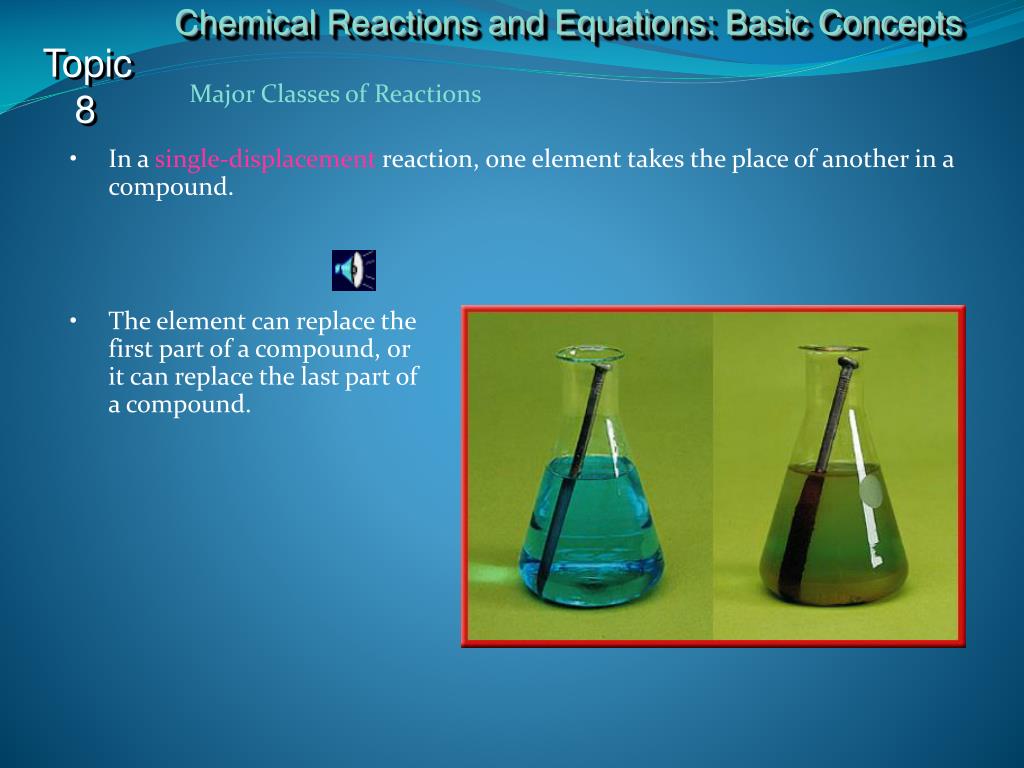 Chemical Reactions and Equations: Basic Concepts Topic 8 Major Classes of Reactions • In a single-displacement reaction, one element takes the place of another in a compound. • The element can replace the first part of a compound, or it can replace the last part of a compound.