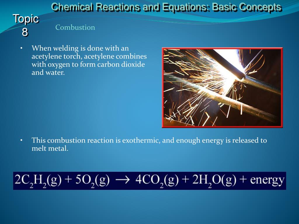 Chemical Reactions and Equations: Basic Concepts Topic 8 Combustion • When welding is done with an acetylene torch, acetylene combines with oxygen to form carbon dioxide and water. • This combustion reaction is exothermic, and enough energy is released to melt metal.