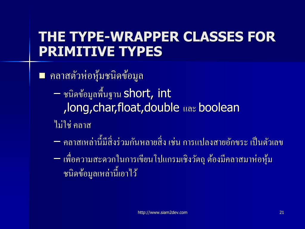 THE TYPE-WRAPPER CLASSES FOR PRIMITIVE TYPES • คลาสตัวห่อหุ้มชนิดข้อมูล • ชนิดข้อมูลพื้นฐาน short, int ,long,char,float,double และ boolean ไม่ใช่ คลาส • คลาสเหล่านี้มีสิ่งร่วมกันหลายสิ่ง เช่น การแปลงสายอักขระ เป็นตัวเลข • เพื่อความสะดวกในการเขียนโปแกรมเชิงวัตถุ ต้องมีคลาสมาห่อหุ้มชนิดข้อมูลเหล่านี้เอาไว้ http://www.siam2dev.com