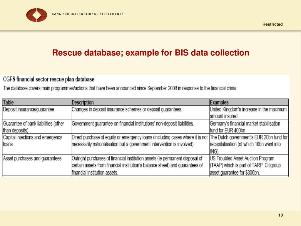 Within the Monetary and Economic Department of the BIS, the financial market crises has triggered an adjustment in business direction. The aim is to get a better understanding of the dynamics and the implications of the crisis and the economic slowdown by implementing the following: • Monitoring financial and macroeconomic indicators • Focussing the research on new or revised research fields 3