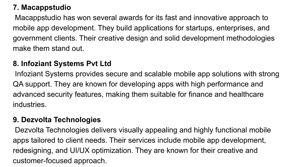 6. 7. Macappstudio Macappstudio has won several awards for its fast and innovative approach to mobile app development. They build applications for startups, enterprises, and government clients. Their creative design and solid development methodologies make them stand out. 8. Infoziant Systems Pvt Ltd Infoziant Systems provides secure and scalable mobile app solutions with strong QA support. They are known for developing apps with high performance and advanced security features, making them suitable for finance and healthcare industries. 9. Dezvolta Technologies Dezvolta Technologies delivers visually appealing and highly functional mobile apps tailored to client needs. Their services include mobile app development, redesigning, and UI/UX optimization. They are known for their creative and customer-focused approach.