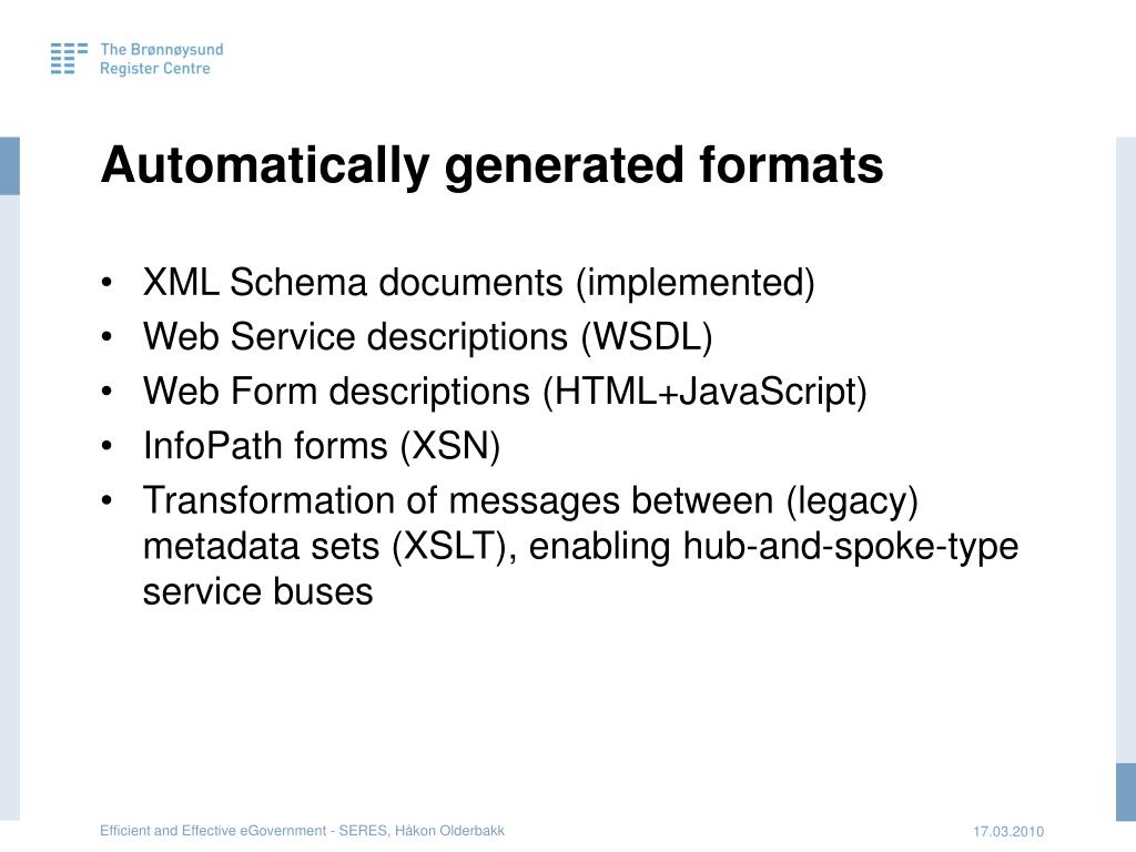 Automatically generated formats • XML Schema documents (implemented) • Web Service descriptions (WSDL) • Web Form descriptions (HTML+JavaScript) • InfoPath forms (XSN) • Transformation of messages between (legacy) metadata sets (XSLT), enabling hub-and-spoke-type service buses Efficient and Effective eGovernment - SERES, Håkon Olderbakk