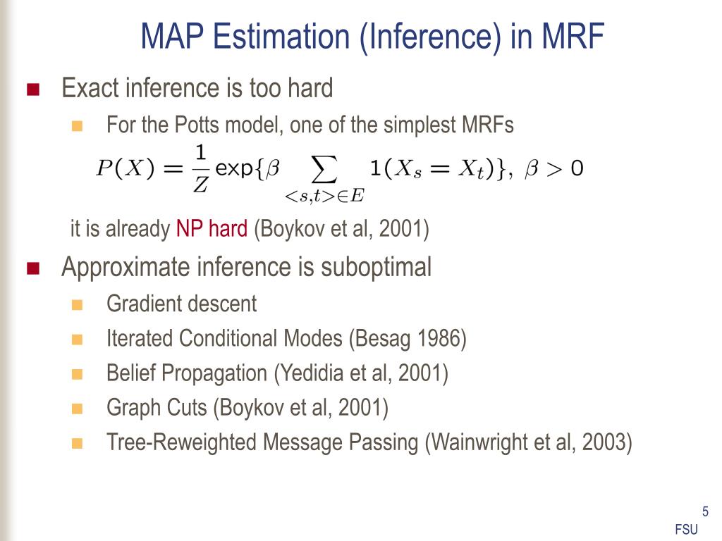 MAP Estimation (Inference) in MRF • Exact inference is too hard • For the Potts model, one of the simplest MRFs it is already NP hard (Boykov et al, 2001) • Approximate inference is suboptimal • Gradient descent • Iterated Conditional Modes (Besag 1986) • Belief Propagation (Yedidia et al, 2001) • Graph Cuts (Boykov et al, 2001) • Tree-Reweighted Message Passing (Wainwright et al, 2003)