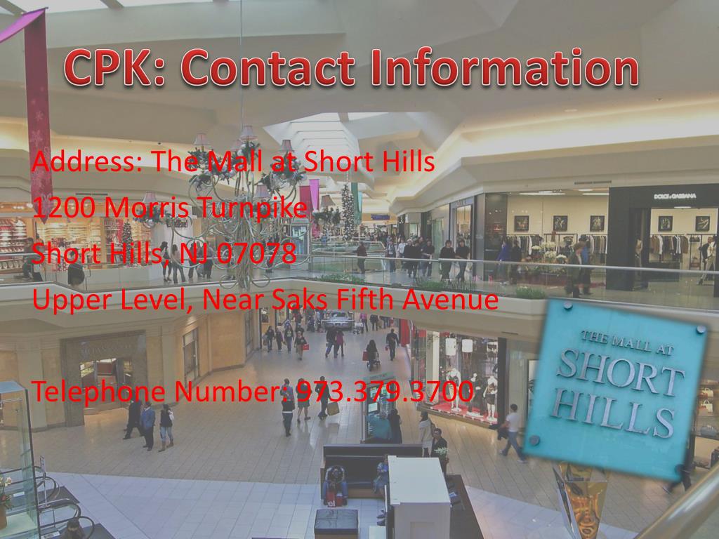 CPK: Contact Information Address: The Mall at Short Hills 1200 Morris Turnpike Short Hills, NJ 07078 Upper Level, Near Saks Fifth Avenue Telephone Number: 973.379.3700