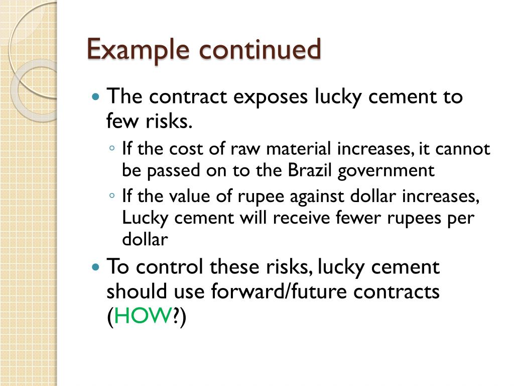 Example continued • The contract exposes lucky cement to few risks. • If the cost of raw material increases, it cannot be passed on to the Brazil government • If the value of rupee against dollar increases, Lucky cement will receive fewer rupees per dollar • To control these risks, lucky cement should use forward/future contracts (HOW?)