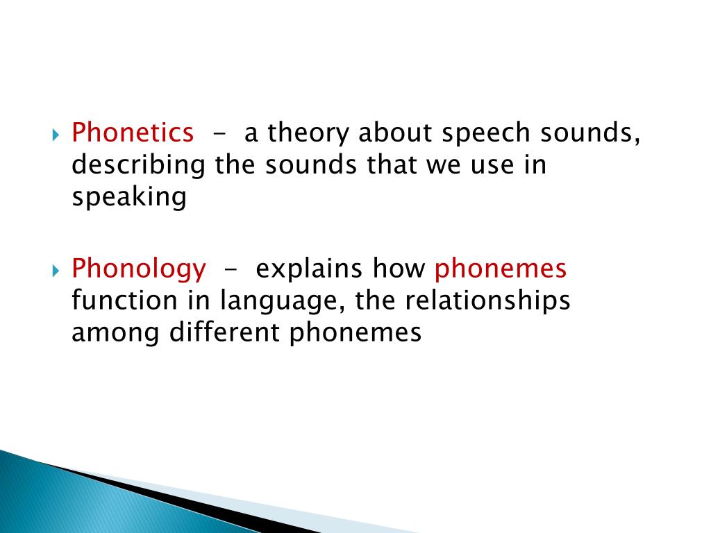Phonetics - a theory about speech sounds, describing the sounds that we use in speaking • Phonology - explains how phonemes function in language, the relationships among different phonemes