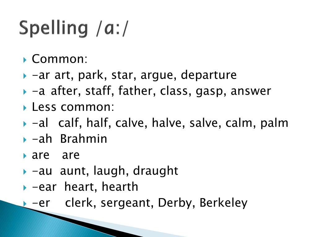 Spelling /ɑ:/ • Common: • -ar art, park, star, argue, departure • -a after, staff, father, class, gasp, answer • Less common: • -al calf, half, calve, halve, salve, calm, palm • -ah Brahmin • are are • -au aunt, laugh, draught • -ear heart, hearth • -er clerk, sergeant, Derby, Berkeley