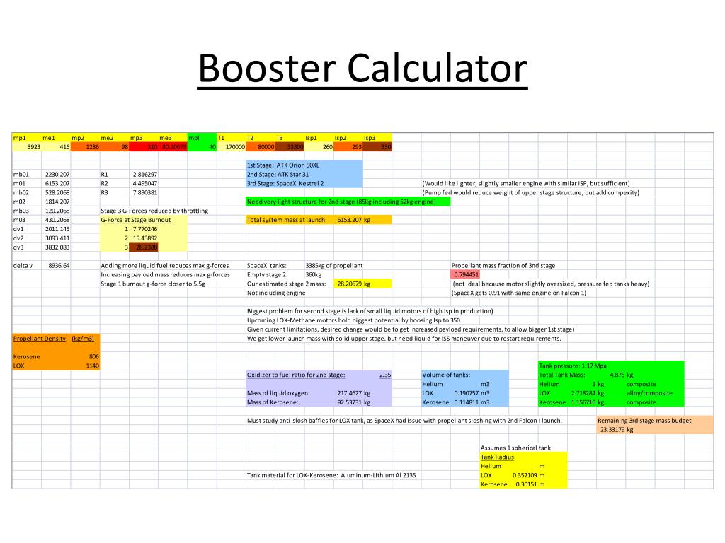 Excel-based preliminary calculations for booster rocket design, utilizing trade study data on solid and liquid rocket motors. Emphasizing takeoff mass delivery to aircraft team with a focus on booster characteristics like thrust, structural mass, and engine restart capability.