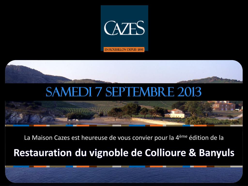 Samedi 7 septembre 2013. La Maison Cazes est heureuse de vous convier pour la 4 ème édition de la Restauration du vignoble de Collioure & Banyuls. POURQUOI ? Contribuer à l’entretien et la restauration du si prestigieux vignoble de Collioure & Banyuls Où ?