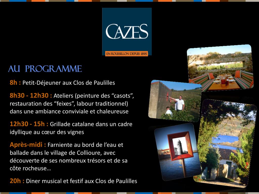AU Programme • 8h : Petit-Déjeuneraux Clos de Paulilles • 8h30 - 12h30 : Ateliers (peinture des “casots”, restauration des “feixes”, labour traditionnel) dans une ambiance conviviale et chaleureuse • 12h30 - 15h : Grillade catalane dans un cadre idyllique au cœur des vignes • Après-midi : Farniente au bord de l’eau et ballade dans le village de Collioure, avec découverte de ses nombreux trésors et de sa côte rocheuse… • 20h :Diner musical et festif aux Clos de Paulilles