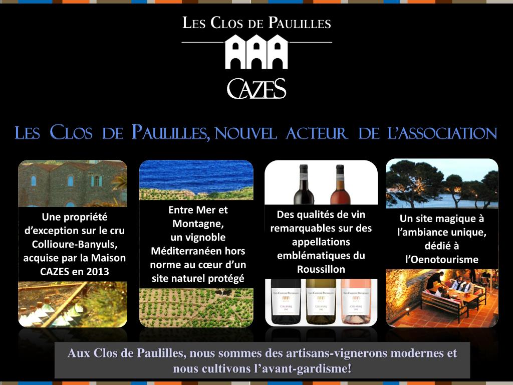 LesClosde Paulilles, nouvel acteurde l’association Entre Mer et Montagne, un vignoble Méditerranéen hors norme au cœur d’un site naturel protégé Des qualités de vin remarquables sur des appellations emblématiques du Roussillon Une propriété d’exception sur le cru Collioure-Banyuls, acquise par la Maison CAZES en 2013 Un site magique à l’ambiance unique, dédié à l’Oenotourisme Aux Clos de Paulilles, nous sommes des artisans-vignerons modernes et nous cultivons l’avant-gardisme!