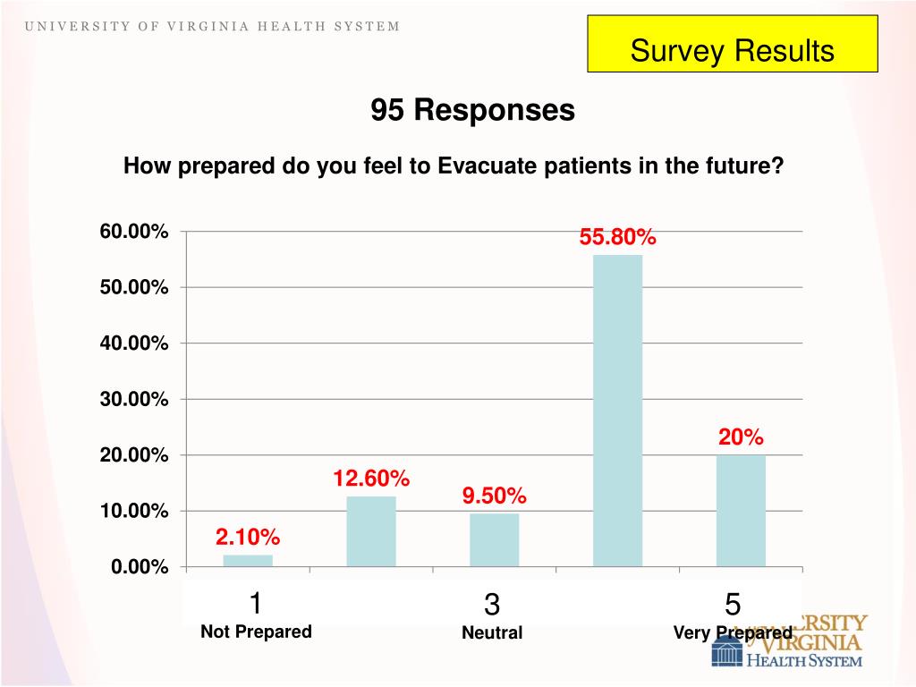 Survey Results 95 Responses How prepared do you feel to Evacuate patients in the future? 1 Not Prepared 5 Very Prepared 3 Neutral