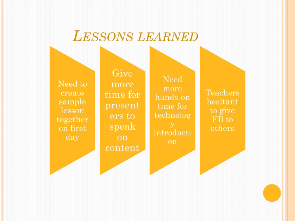 Participation and retention • F2F participation: 23 • Submitted lessons: 15 *Some teachers did not have time to do lessons or did not need the in-service points.*