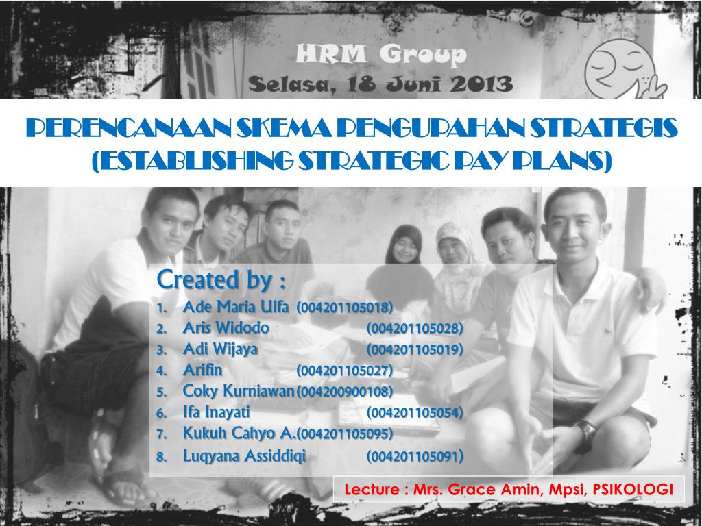 Perencanaanskemapengupahanstrategis(ESTABLISHING STRATEGIC PAY PLANS) Created by : Ade Maria Ulfa (004201105018) ArisWidodo (004201105028) AdiWijaya (004201105019) Arifin (004201105027) CokyKurniawan (004200900108) IfaInayati (004201105054) KukuhCahyo A. (004201105095) LuqyanaAssiddiqi (004201105091) Lecture : Mrs. Grace Amin, Mpsi, PSIKOLOGI