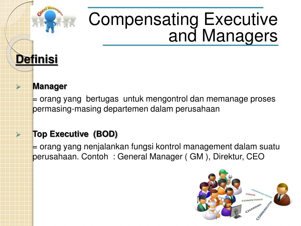 Compensating Executive and Managers Definisi • Manager = orang yang bertugasuntukmengontroldanmemanage proses permasing-masingdepartemendalamperusahaan • Top Executive (BOD) = orang yang nenjalankanfungsikontrol management dalamsuatuperusahaan. Contoh : General Manager ( GM ), Direktur, CEO