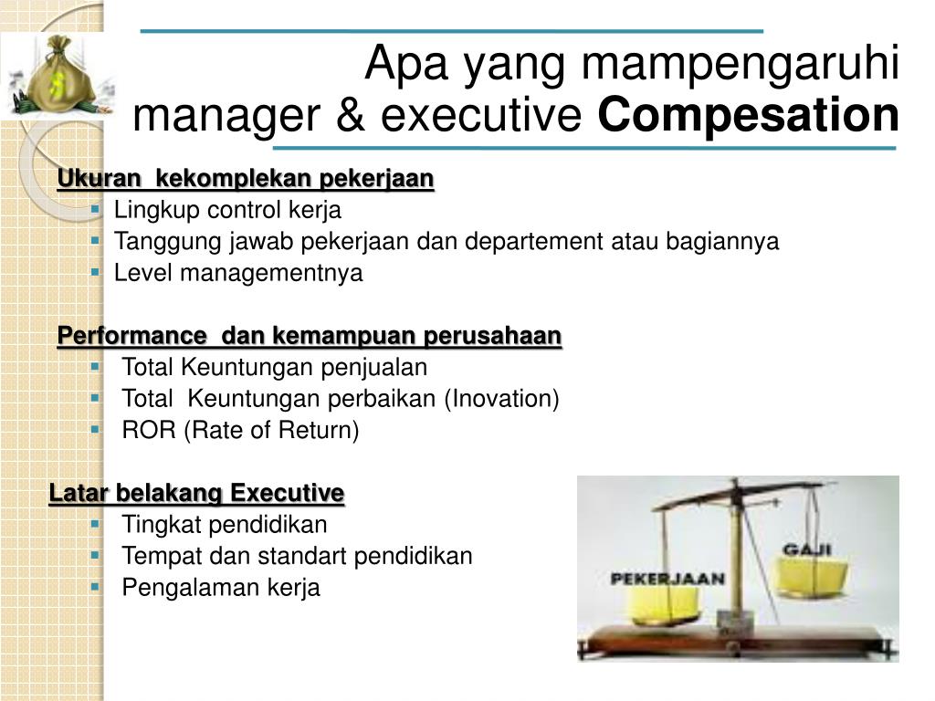 Apa yang mampengaruhi manager & executive Compesation Ukurankekomplekanpekerjaan • Lingkup control kerja • Tanggungjawabpekerjaandandepartementataubagiannya • Level managementnya Performance dankemampuanperusahaan • Total Keuntunganpenjualan • Total Keuntunganperbaikan (Inovation) • ROR (Rate of Return) Latarbelakang Executive • Tingkat pendidikan • Tempatdanstandartpendidikan • Pengalamankerja