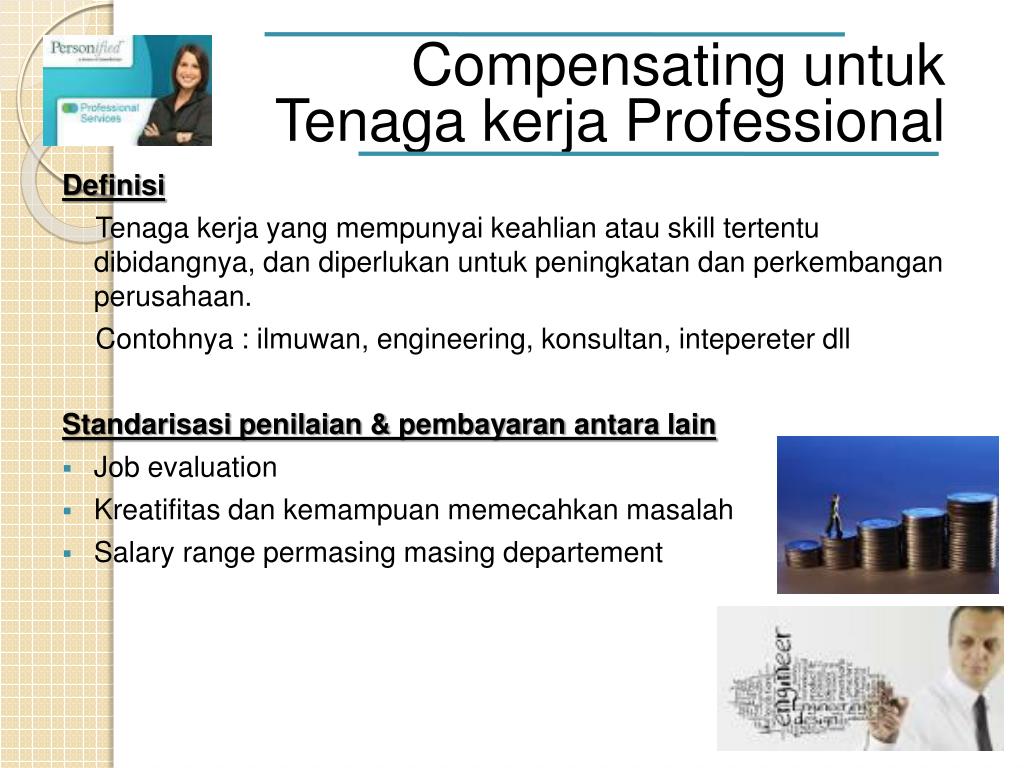 Compensating untuk Tenagakerja Professional Definisi Tenagakerja yang mempunyaikeahlianatau skill tertentudibidangnya, dandiperlukanuntukpeningkatandanperkembanganperusahaan. Contohnya : ilmuwan, engineering, konsultan, intepereterdll Standarisasipenilaian & pembayaranantara lain • Job evaluation • Kreatifitasdankemampuanmemecahkanmasalah • Salary range permasingmasingdepartement