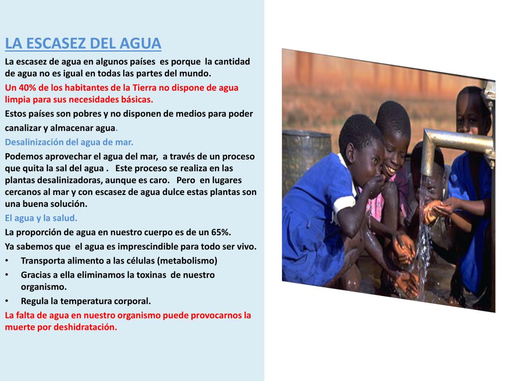 LA ESCASEZ DEL AGUA La escasez de agua en algunos países es porque la cantidad de agua no es igual en todas las partes del mundo. Un 40% de los habitantes de la Tierra no dispone de agua limpia para sus necesidades básicas. Estos países son pobres y no disponen de medios para poder canalizar y almacenar agua. Desalinización del agua de mar. Podemos aprovechar el agua del mar, a través de un proceso que quita la sal del agua . Este proceso se realiza en las plantas desalinizadoras, aunque es caro. Pero en lugares cercanos al mar y con escasez de agua dulce estas plantas son una buena solución. El agua y la salud. La proporción de agua en nuestro cuerpo es de un 65%. Ya sabemos que el agua es imprescindible para todo ser vivo. Transporta alimento a las células (metabolismo) Gracias a ella eliminamos la toxinas de nuestro organismo. Regula la temperatura corporal. La falta de agua en nuestro organismo puede provocarnos la muerte por deshidratación.