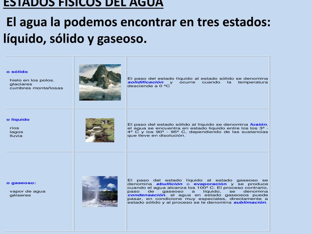 ESTADOS FÍSICOS DEL AGUA El agua la podemos encontrar en tres estados: líquido, sólido y gaseoso.