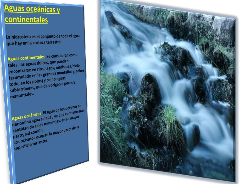 Aguas oceánicas y continentales La hidrosfera es el conjunto de toda el agua que hay en la corteza terrestre. Aguas continentales. Se consideran como tales, las aguas dulces, que pueden encontrarse en ríos, lagos, marismas, hielo (acumulado en las grandes montañas y, sobre todo, en los polos) y como aguas subterráneas, que dan origen a pozos y manantiales. Aguas oceánicas. El agua de los océanos se denomina agua salada , ya que contiene gran cantidad de sales minerales, en su mayor parte, sal común. Los océanos ocupan la mayor parte de la superficie terrestre.