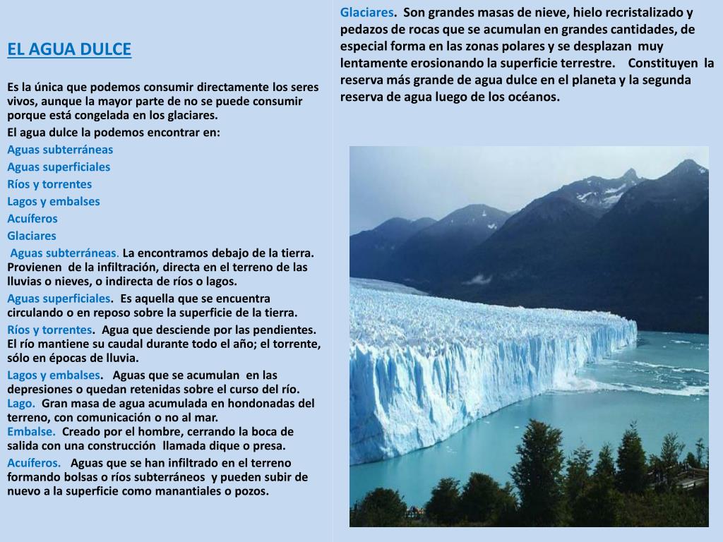 Glaciares. Son grandes masas de nieve, hielo recristalizado y pedazos de rocas que se acumulan en grandes cantidades, de especial forma en las zonas polares y se desplazan muy lentamente erosionando la superficie terrestre. Constituyen la reserva más grande de agua dulce en el planeta y la segunda reserva de agua luego de los océanos. EL AGUA DULCE Es la única que podemos consumir directamente los seres vivos, aunque la mayor parte de no se puede consumir porque está congelada en los glaciares. El agua dulce la podemos encontrar en: Aguas subterráneas Aguas superficiales Ríos y torrentes Lagos y embalses Acuíferos Glaciares Aguas subterráneas.La encontramos debajo de la tierra.Provienen de la infiltración, directa en el terreno de laslluvias o nieves, o indirecta de ríos o lagos. Aguas superficiales. Es aquella que se encuentra circulando o en reposo sobre la superficie de la tierra. Ríos y torrentes. Agua que desciende por las pendientes. El río mantiene su caudal durante todo el año; el torrente, sólo en épocas de lluvia. Lagos y embalses. Aguas que se acumulan en las depresiones o quedan retenidas sobre el curso del río. Lago. Gran masa de agua acumulada en hondonadas del terreno, con comunicación o no al mar. Embalse.Creado por el hombre, cerrando la boca de salida con una construcción llamada dique o presa. Acuíferos. Aguas que se han infiltrado en el terreno formando bolsas o ríos subterráneos y pueden subir de nuevo a la superficie como manantiales o pozos.