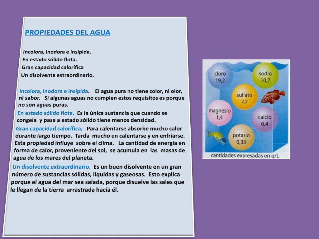 PROPIEDADES DEL AGUA Incolora, inodora e insípida. En estado sólido flota. Gran capacidad calorífica Un disolvente extraordinario. Incolora, inodora e insípida. El agua pura no tiene color, ni olor, ni sabor. Si algunas aguas no cumplen estos requisitos es porque no son aguas puras. En estado sólido flota. Es la única sustancia que cuando se congela y pasa a estado sólido tiene menos densidad. Gran capacidad calorífica. Para calentarse absorbe mucho calor durante largo tiempo. Tarda mucho en calentarse y en enfriarse. Esta propiedad influye sobre el clima. La cantidad de energía en forma de calor, proveniente del sol, se acumula en las masas de agua de los mares del planeta. Un disolvente extraordinario. Es un buen disolvente en un gran número de sustancias sólidas, líquidas y gaseosas. Esto explica porque el agua del mar sea salada, porque disuelve las sales que le llegan de la tierra arrastrada hacía él.