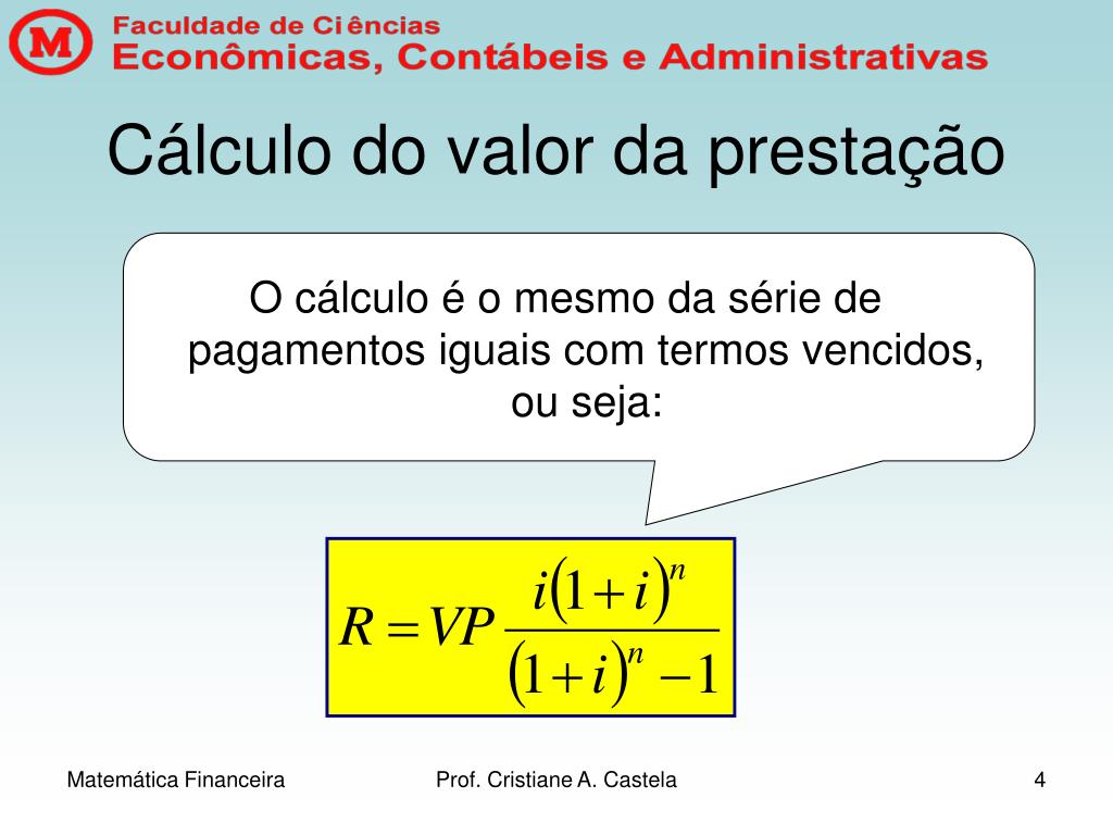 Cálculo do valor da prestação O cálculo é o mesmo da série de pagamentos iguais com termos vencidos, ou seja: Prof. Cristiane A. Castela