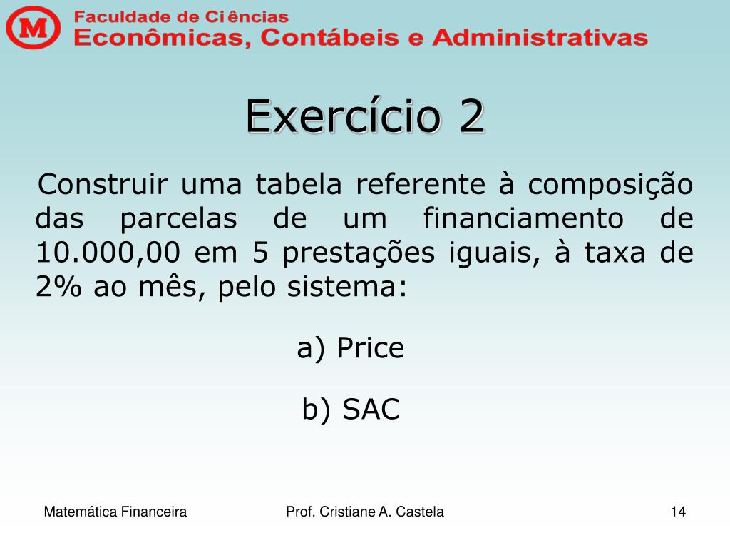 Exercício 2 Construir uma tabela referente à composição das parcelas de um financiamento de 10.000,00 em 5 prestações iguais, à taxa de 2% ao mês, pelo sistema: a) Price b) SAC Prof. Cristiane A. Castela