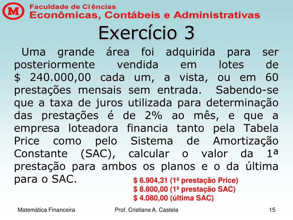 Exercício 3 Uma grande área foi adquirida para ser posteriormente vendida em lotes de $ 240.000,00 cada um, a vista, ou em 60 prestações mensais sem entrada. Sabendo-se que a taxa de juros utilizada para determinação das prestações é de 2% ao mês, e que a empresa loteadora financia tanto pela Tabela Price como pelo Sistema de Amortização Constante (SAC), calcular o valor da 1ª prestação para ambos os planos e o da última para o SAC. $ 6.904,31 (1ª prestação Price) $ 8.800,00 (1ª prestação SAC) $ 4.080,00 (última SAC) Prof. Cristiane A. Castela
