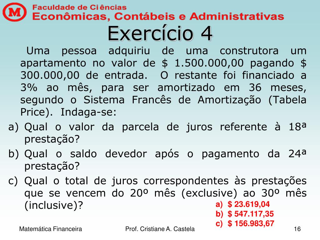 Exercício 4 Uma pessoa adquiriu de uma construtora um apartamento no valor de $ 1.500.000,00 pagando $ 300.000,00 de entrada. O restante foi financiado a 3% ao mês, para ser amortizado em 36 meses, segundo o Sistema Francês de Amortização (Tabela Price). Indaga-se: • Qual o valor da parcela de juros referente à 18ª prestação? • Qual o saldo devedor após o pagamento da 24ª prestação? • Qual o total de juros correspondentes às prestações que se vencem do 20º mês (exclusive) ao 30º mês (inclusive)? • $ 23.619,04 • $ 547.117,35 • $ 156.983,67 Prof. Cristiane A. Castela
