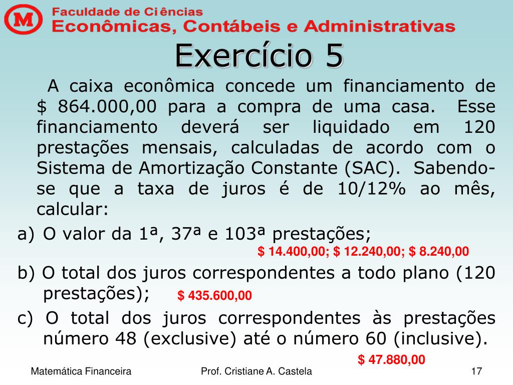 Exercício 5 A caixa econômica concede um financiamento de $ 864.000,00 para a compra de uma casa. Esse financiamento deverá ser liquidado em 120 prestações mensais, calculadas de acordo com o Sistema de Amortização Constante (SAC). Sabendo-se que a taxa de juros é de 10/12% ao mês, calcular: • O valor da 1ª, 37ª e 103ª prestações; b) O total dos juros correspondentes a todo plano (120 prestações); c) O total dos juros correspondentes às prestações número 48 (exclusive) até o número 60 (inclusive). $ 14.400,00; $ 12.240,00; $ 8.240,00 $ 435.600,00 $ 47.880,00 Prof. Cristiane A. Castela