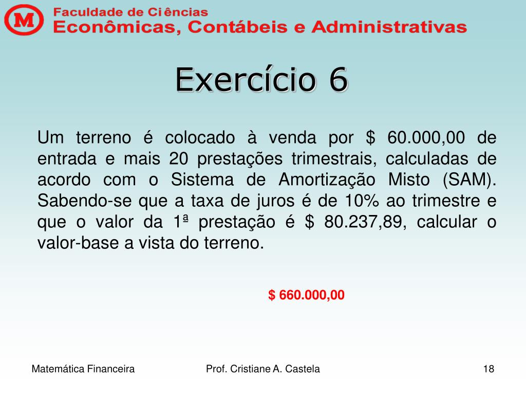 Exercício 6 Um terreno é colocado à venda por $ 60.000,00 de entrada e mais 20 prestações trimestrais, calculadas de acordo com o Sistema de Amortização Misto (SAM). Sabendo-se que a taxa de juros é de 10% ao trimestre e que o valor da 1ª prestação é $ 80.237,89, calcular o valor-base a vista do terreno. $ 660.000,00 Prof. Cristiane A. Castela