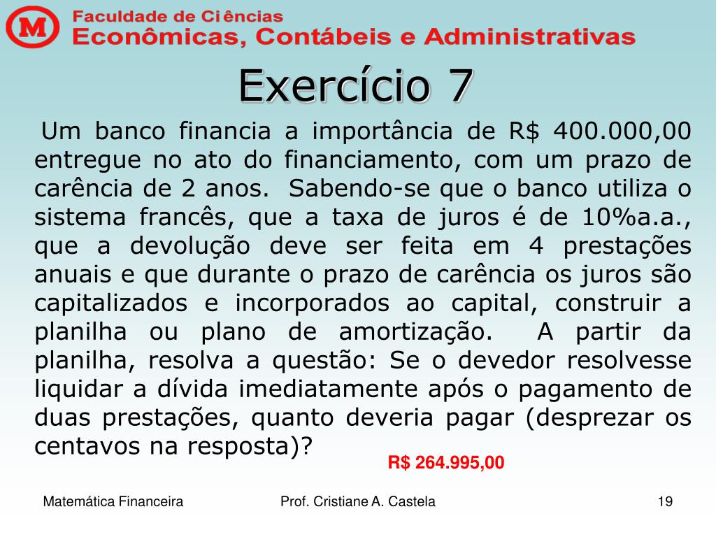 Exercício 7 Um banco financia a importância de R$ 400.000,00 entregue no ato do financiamento, com um prazo de carência de 2 anos. Sabendo-se que o banco utiliza o sistema francês, que a taxa de juros é de 10%a.a., que a devolução deve ser feita em 4 prestações anuais e que durante o prazo de carência os juros são capitalizados e incorporados ao capital, construir a planilha ou plano de amortização. A partir da planilha, resolva a questão: Se o devedor resolvesse liquidar a dívida imediatamente após o pagamento de duas prestações, quanto deveria pagar (desprezar os centavos na resposta)? R$ 264.995,00 Prof. Cristiane A. Castela